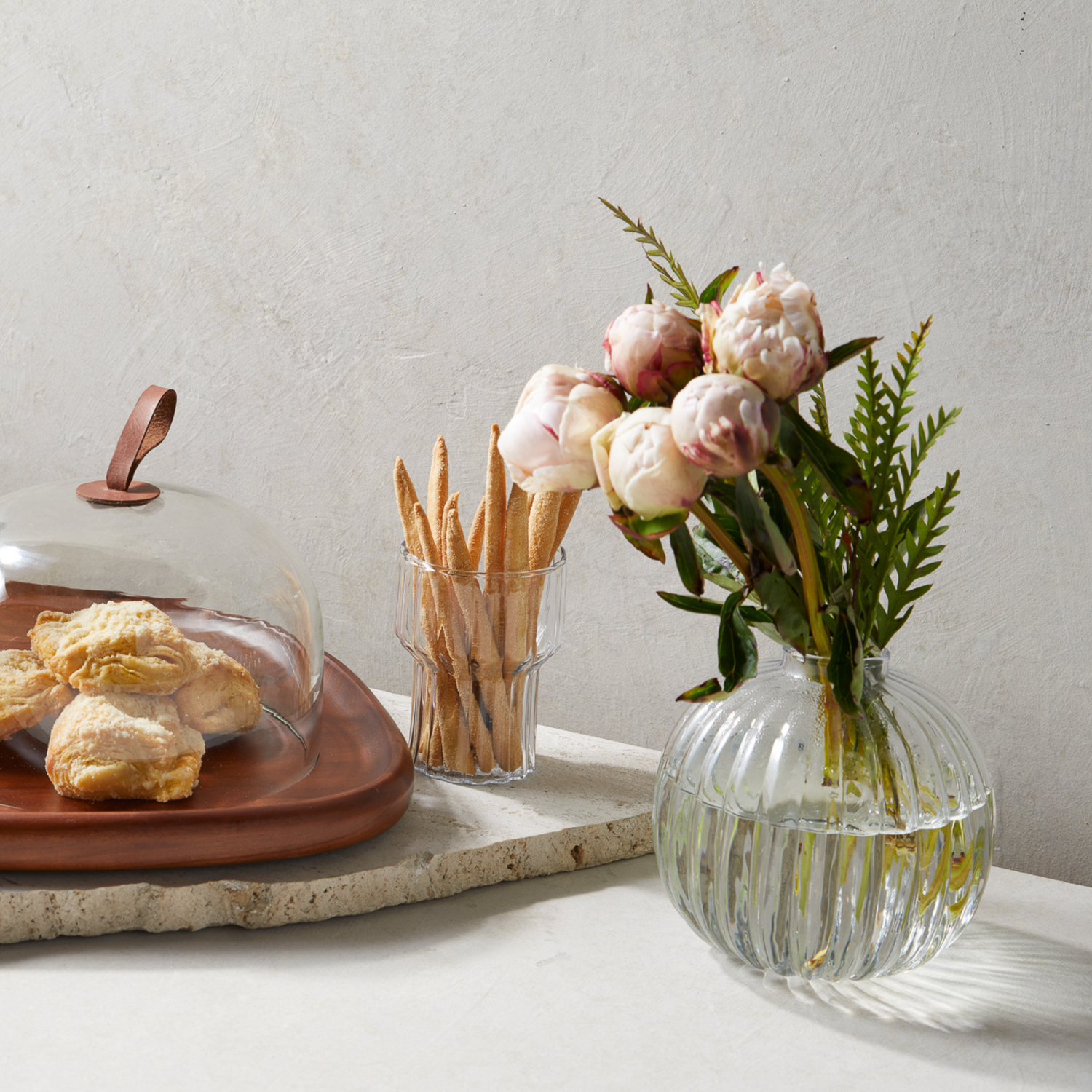 Our Shae glassware collection is slender and minimal with a ribbed texture that feels good to hold in your hand. Elegant yet functional, this creative assortment is crafted by hand from pressed glass in small batches, making each set truly one of a kind.